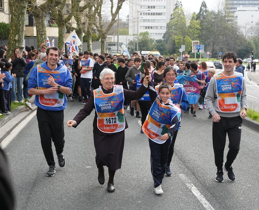 El ambiente ha sido inmejorable: la acera llena de alumnado y familias, aplaudiendo, animando y arropando con entusiasmo a quienes corrían llevando el testigo y a ese otro gran grupo que avanzaba tras la pancarta oficial de la KORRIKA. Ha sido, además, un honor para nuestro colegio portar ese testigo y dar testimonio ante toda la comunidad de nuestro compromiso con el euskera. Ese testigo, que guarda un mensaje secreto, ha pasado por miles de manos a lo largo de kilómetros y kilómetros, simbolizando el amor de todo un pueblo por su ancestral lengua y el deseo de que siga siendo uN legado vivo que perdure para siempre.