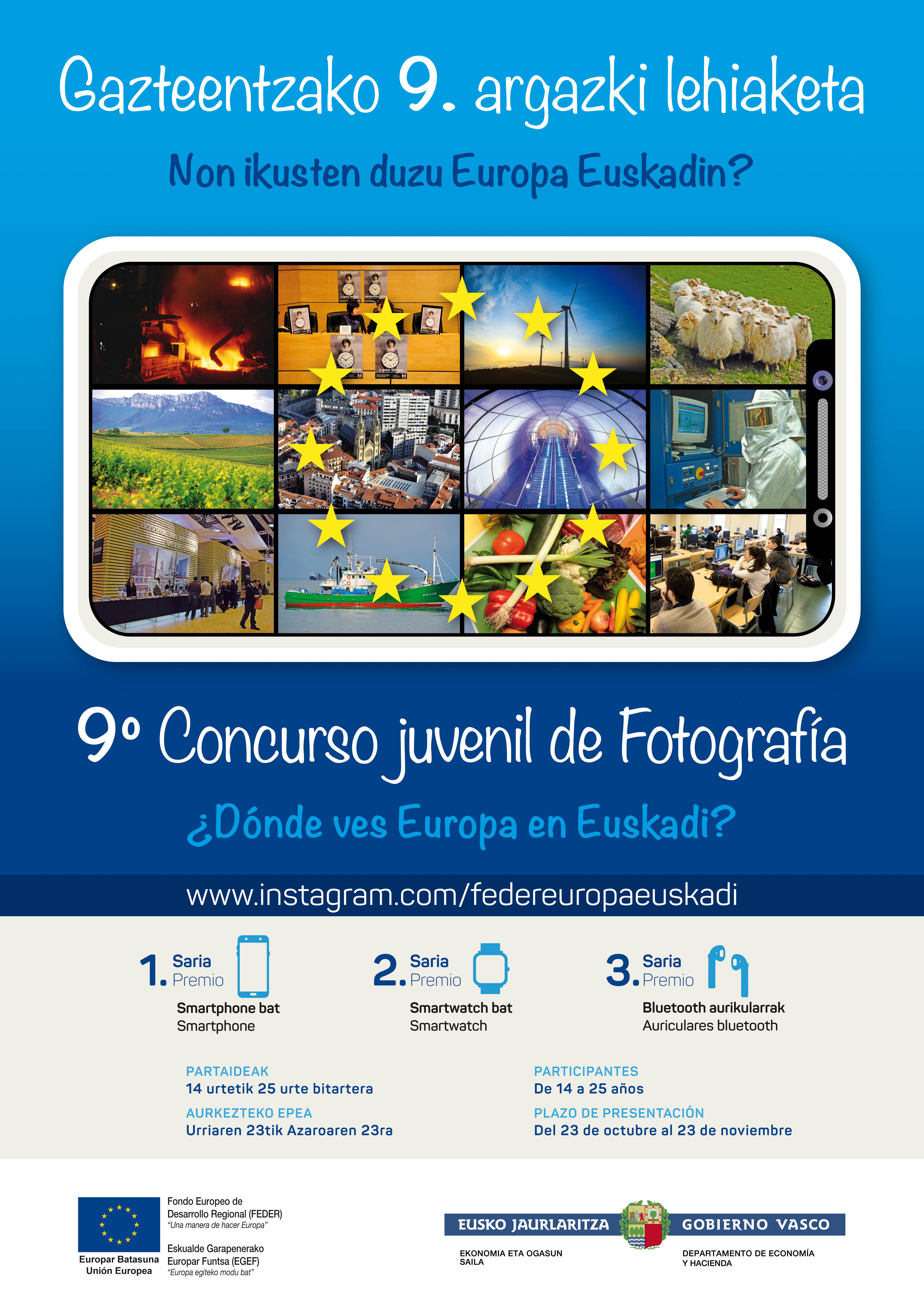 Concurso fotográfico “Dónde ves Europa en Euskadi?Dirigido a jóvenes de entre 14 y 25 años El Gobierno Vasco ha abierto el plazo de participación en la 9ª edición del Concurso Fotográfico juvenil “¿Dónde ves Europa en Euskadi?”. Entre el 23 de octubre y el 23 de noviembre se podrán presentar fotos originales que reflejen las actividades, inversiones o iniciativas apoyadas por los Fondos FEDER y la Unión Europea en la CAPV. Desde las infraestructuras de transporte hasta los programas de desarrollo social, todas las acciones que cuenten o hayan contado con la participación de Europa, pueden ser objeto de interés para el concurso. Los requisitos para participar son: tener entre 14 y 25 años, subir una foto a través de la cuenta de FEDER Euskadi en instagram (www.instagram.com/federeuropaeuskadi), e incluir un comentario explicativo y el TAG #FEDER2020 . Las fotos más votadas pasarán a la final, donde un jurado seleccionará a dos ganadores en función de su originalidad y adecuación al objeto del concurso. Habrá un tercer premio para la fotografía que obtenga más votos por parte del público. Los premios son: un smartphone, un smartwatch o unos auriculares bluetooth.