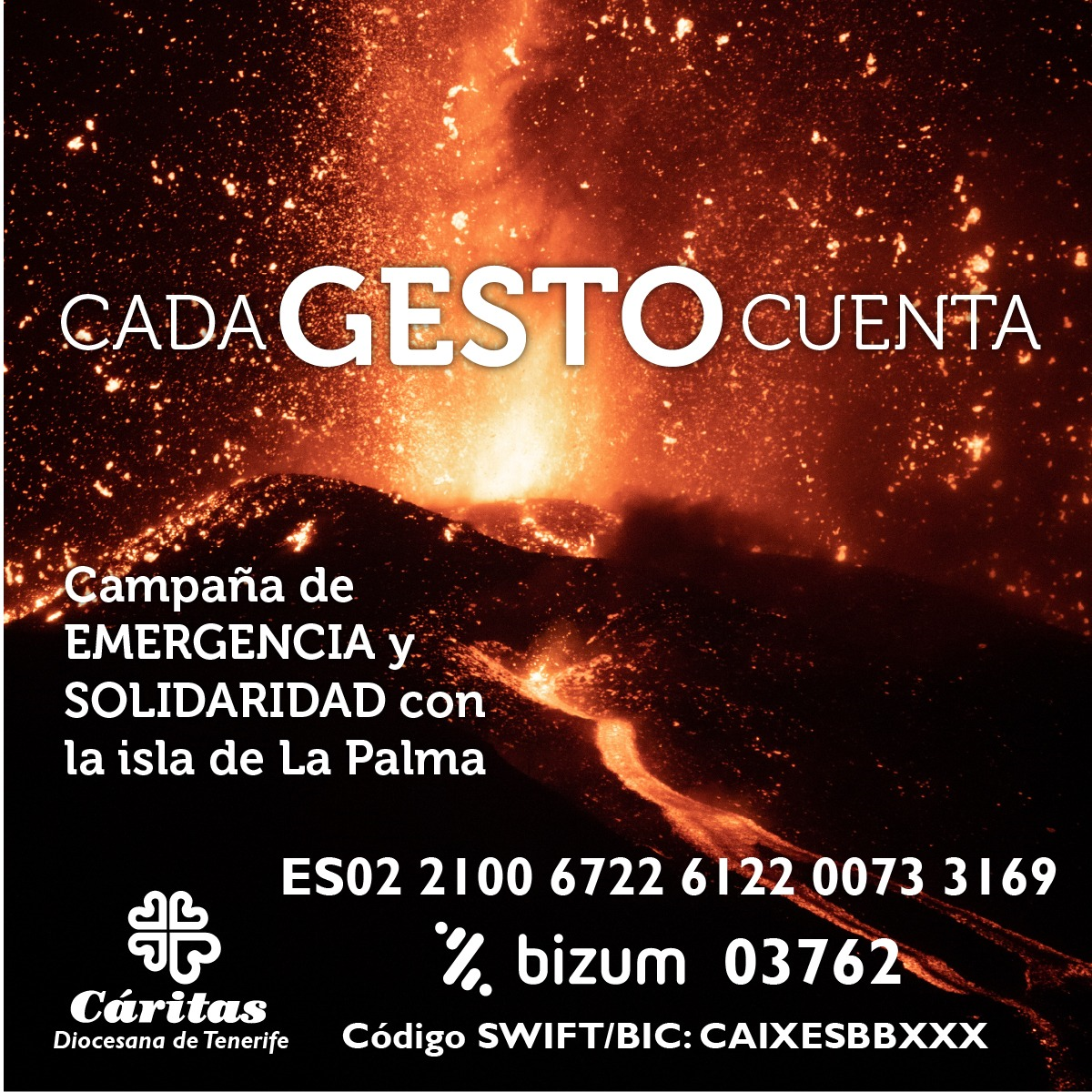 Por último, para colaborar con Cáritas en su campaña de emergencia y solidaridad con la isla de La Palma facilitamos un número de cuenta y Bizum. Cada uno puede contribuir con la cantidad que crea oportuno.