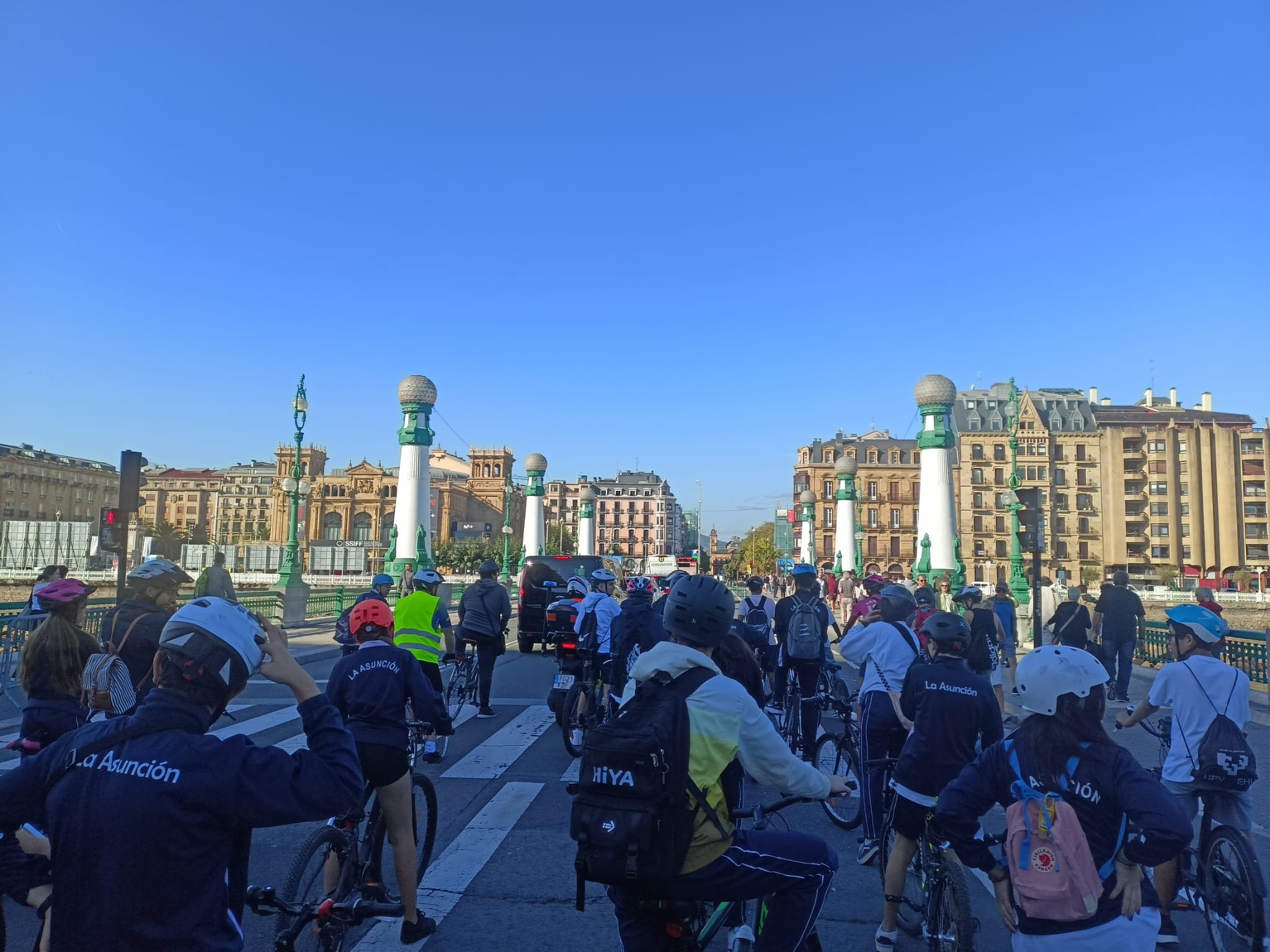 Un total de 800 jóvenes de 12 colegios e institutos donostiarras, junto a representantes del Ayuntamiento de San Sebastián, de la UPV, de la iniciativa En Bici Sin Edad y de Txita, recorrieron ayer por la mañana los diez kilómetros de la ‘Bizikletada’.